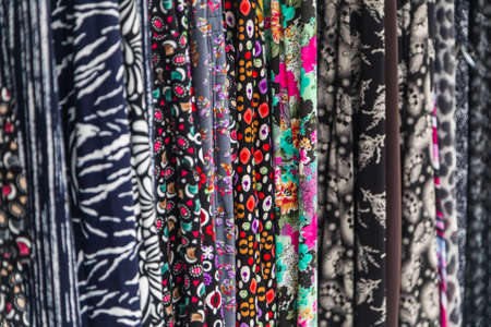 Close up view on colorful hanging and folded fabric textures and textiles in high resolution found on a fabrics market