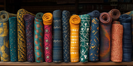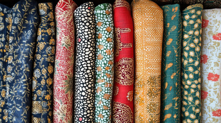 Colorful rolls of fabric arranged closely, showcasing various intricate patterns and vibrant hues. Textile shop setting with warm natural lighting. Concept of fashion design, crafts, home decor.