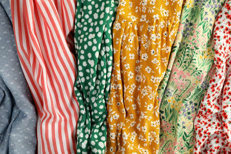 Large rows of pieces of fabric made of cotton, polyester, and other materials in different colors and prints of clothing, soft focus