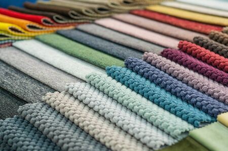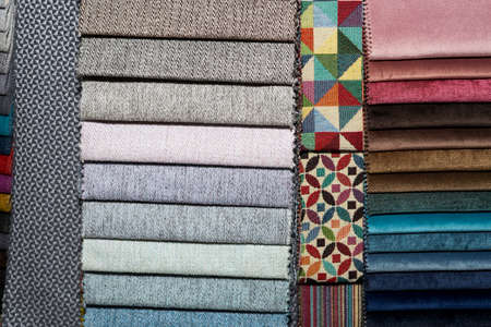 Colorful upholstery fabric samples in the store. Types Of Fabrics.