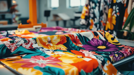 A close-up view of colorful floral fabric displayed on a print table in a stylish textile studio. The vibrant colors and patterns showcase creativity and artistry in fabric design.
