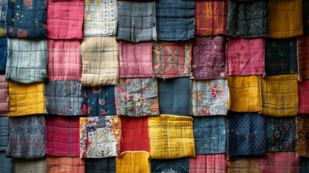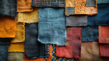 fabric patchwork art, various fabric scraps with different patterns and textures arranged on a surface creating a patchwork textile design background