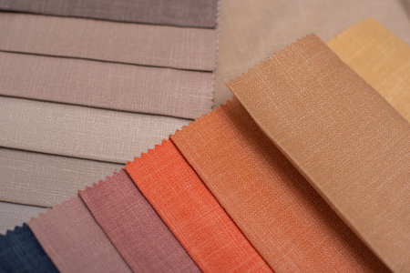 Dense textured fabric for curtains. Fabric samples for curtains in beige, orange and blue colors.