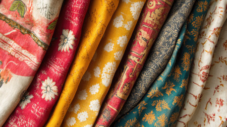 This vibrant image showcases a variety of textiles and fabrics, presenting a rich tapestry of colors, patterns, and textures ideal for design inspiration.