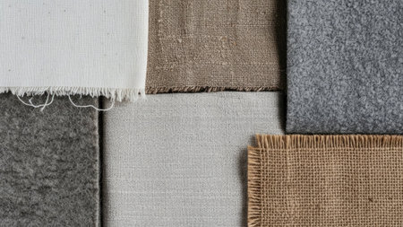 An overhead view presents diverse fabric samples showcasing various textures and neutral color palettes. The composition includes textures of woven, felted, and raw materials. The image utilizes natural lighting, emphasizing the tactile qualities of each fabric, potentially suitable for design, textile, or material-related projects.