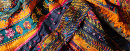 A close-up shot of a vibrant loincloth with detailed embroidery in bold colors, highlighting the intricate craftsmanship, set against a plain backdrop.