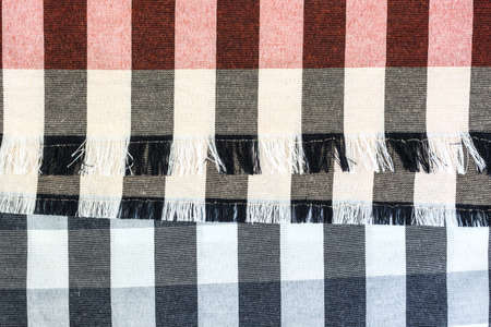 picnic cloth. The checkered tablecloth on a table. Texture of white fabric in a red cell. Background image. Blank checkered fabric texture