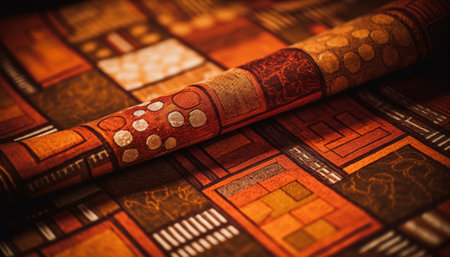 Rolls of vibrant fabrics displaying intricate patterns and rich colors. Arranged on a dark backdrop, this concept highlights textiles ideal for fashion design, crafting, and home decor.