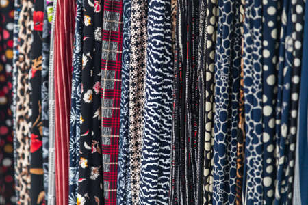Large rows of pieces of fabric made of cotton, polyester, and other materials in different colors and prints of clothing, soft focus