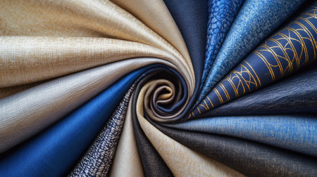 Luxurious fabric swatches in shades of indigo, cobalt, beige, and gold, arranged in a spiral pattern on a neutral background, perfect for design inspiration.