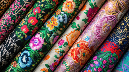 A stunning collection of textile rolls showcases vibrant floral embroidery patterns, highlighting intricate details and a rich variety of colors and textures.