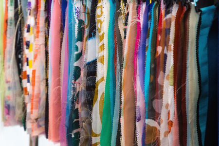Detailed close up view on samples of cloth and fabrics in different colors found at a fabrics market.
