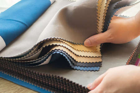 fabric made of different materials, shapes and colors for the production of clothing. The hand touches and selects the fabric