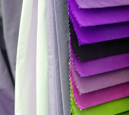 Detailed close up view on samples of cloth and fabrics in different colors found at a fabrics market.