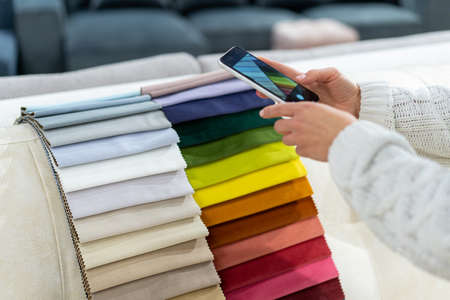 The woman chooses the fabric on the sofa taking pictures of fabric samples on phone. Tissue catalog