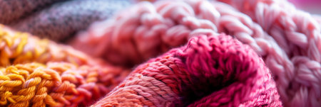 A colorful knitted fabric with a variety of colors and textures. Concept of warmth and comfort, as the different colors and textures of the yarn create a cozy and inviting atmosphere