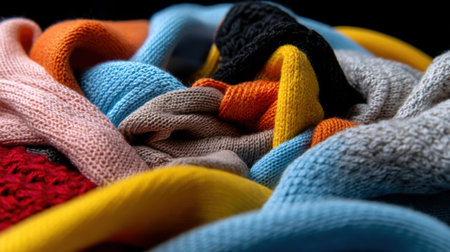 A pile of colorful knitwear, including a pink and yellow sweater. The pile is a mix of different colors and textures, creating a vibrant and cozy atmosphere