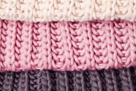 Stack of knitte clothes closeup. Winter season. Selective focus.