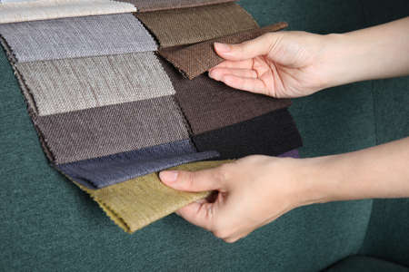 Woman choosing fabric among colorful samples on green sofa, closeup