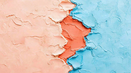 A close-up view of thick, impasto paint strokes in coral, peach, and sky blue, creating a tactile and visually dynamic abstract composition.