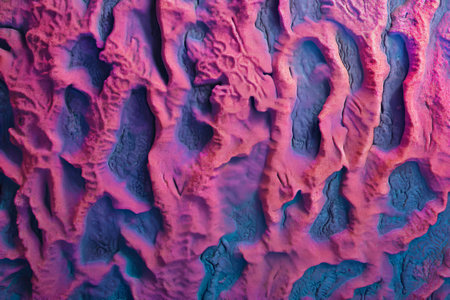 Close-up of coral reef surface, intricate branching coral structures in vivid pinks and purples.