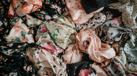 An exquisite array of delicate fabrics featuring vibrant floral designs and playful polka dots, showcasing a beautiful interplay of texture and color.