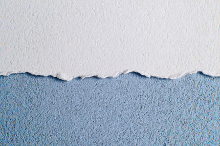 A torn paper texture shows a pale blue lower section with film grain overlay on top.