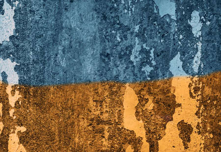 Yellow and blue Ukrainian flag on a peeling paint wall. Stop the war, help Ukraine
