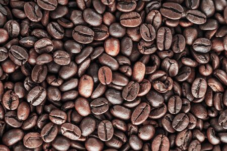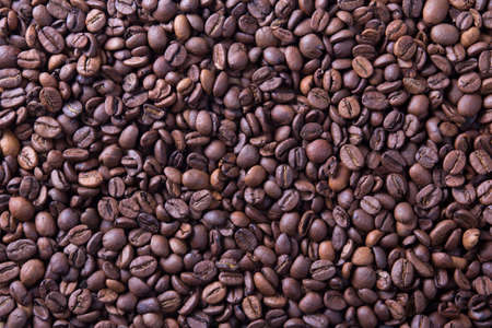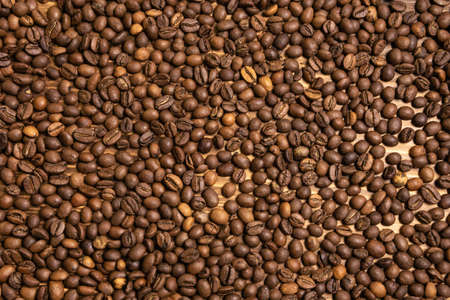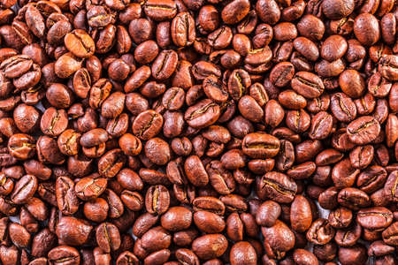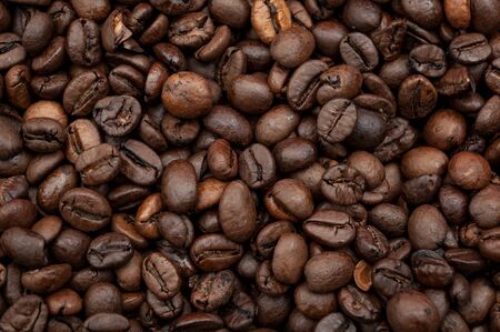 Top view of a many of aromatic quality roasted coffee beans. Background. Coffee harvest.