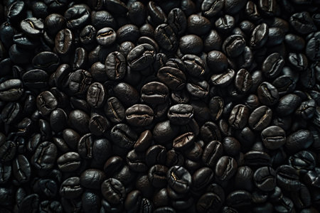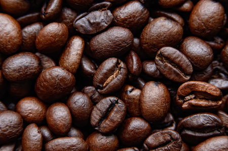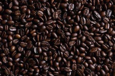 Texture of dark brown roasted coffee beans, close-up