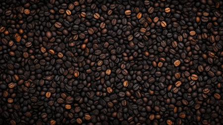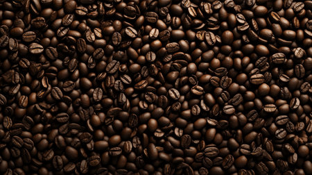A multitude of roasted coffee beans filling the frame, providing a detailed texture that coffee enthusiasts might find appealing due to the beans' rich, dark color