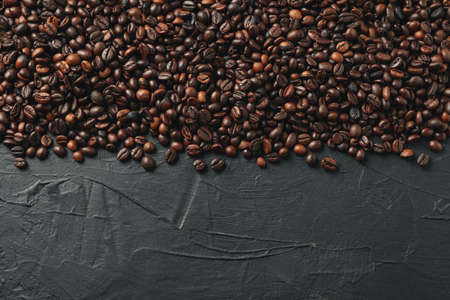 Fresh roasted coffee beans closeup on black stone background. Food pattern. Top view, flat lay with copy space