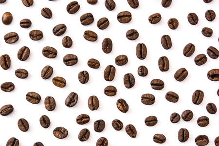Roasted coffee beans on a white background. Top view, flat lay