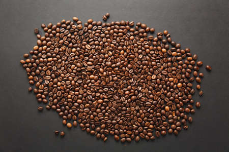 Roasted brown coffee beans on the black concrete stone background. Flatlay style, messy pattern.
