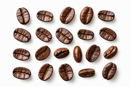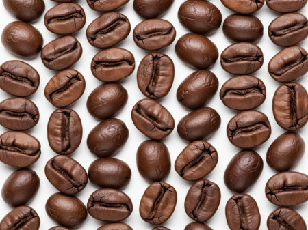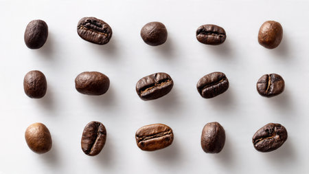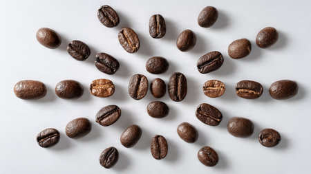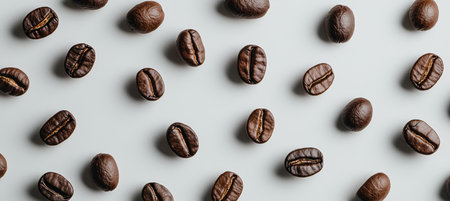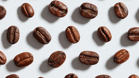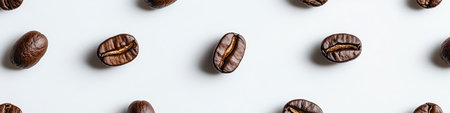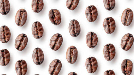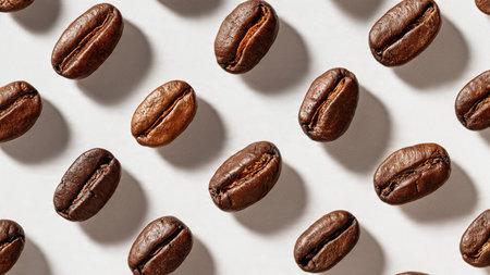 Pattern of Roasted Coffee Beans Scattered on a White Background, Top View, Minimalist Design