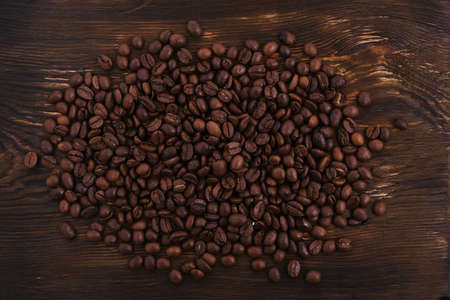 Roasted coffee beans on the old wooden table. Coffee bean close up shot. Coffee beans background. High quality photo.