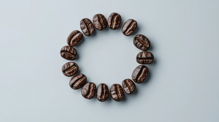 A top view of freshly roasted coffee beans arranged in a circular pattern. The dark, shiny surface highlights their rich texture and aroma, perfect for coffee enthusiasts.