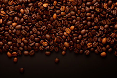 Coffee Fiesta: Top-down view shot of a profusion of scattered roasted coffee beans, forming a captivating backdrop for text or marketing