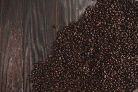 Roasted coffee beans on brown background with copy space. Close up top view. High quality photo