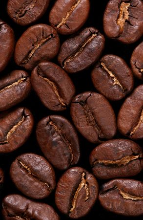 Extreme close-up of coffee beans isolated on black