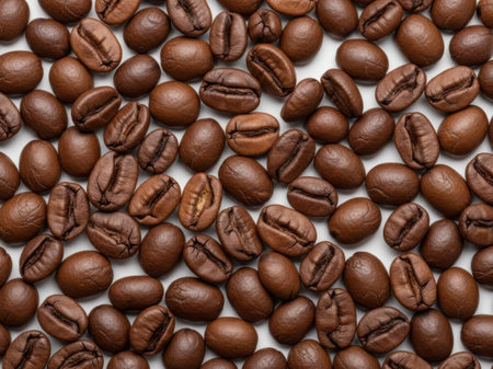 Aromatic roasted coffee beans scattered on a white backdrop, showcasing vibrant textures and colors.
