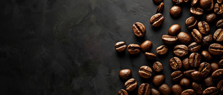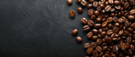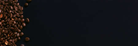 Banner with fresh roasted coffee beans closeup on black stone background. Top view, flat lay with copy space