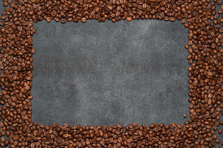 Arabica coffee beans on a stone background. Dark coffee beans on rustic background. Close up. Top view.