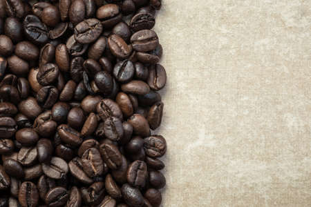 Coffee beans background, empty with copy space for text. Food texture, roasted fragrant appetizing brown arabica beans on a vintage surface of old paper