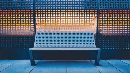 This image showcases a modern bench with a perforated backrest, set in an urban transit environment during sunset, highlighting design and serenity.