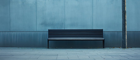 A solitary black bench sits on a pavement beside a blue wall creating a tranquil and minimalistic atmosphere perfect for reflection.