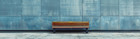 This high-resolution photograph showcases a lone wooden bench against a vividly blue-tinted wall. The wall's unique pattern and the bench's simplicity make it ideal for concepts related to loneliness, waiting, and the contrast of man-made and natural elements.