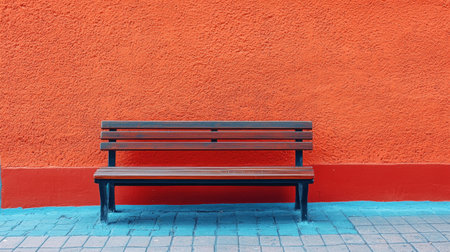 A minimalist wooden bench placed against a bold orange wall, showcasing a simple yet striking design, perfect for urban, architectural, and modern themes.