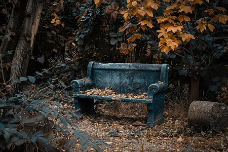 Autumn landscape with creepy bench surrounded by fallen leaves and foliage