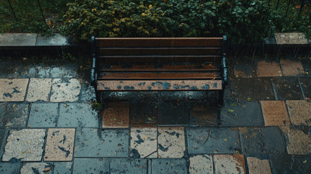 A serene park scene featuring an empty wooden bench surrounded by wet stones and falling rain, capturing a quiet moment of solitude in nature.